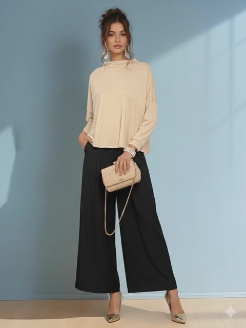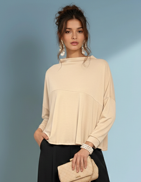 Bluză largă cu guler înalt crem, confortabilă și modernă, perfectă pentru ținute casual sau relaxate. Croiala lejeră și gulerul înalt oferă un aspect elegant și un plus de stil fiecărei ținute.