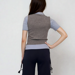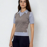 Pulover cu mânecă scurtă, guler cămașă și nasturi gri impresionează prin simplitatea sofisticată. Griul neutru este accentuat de croiala clasică și detaliile de design, făcându-l ideal pentru stiluri minimaliste.