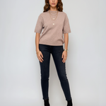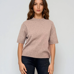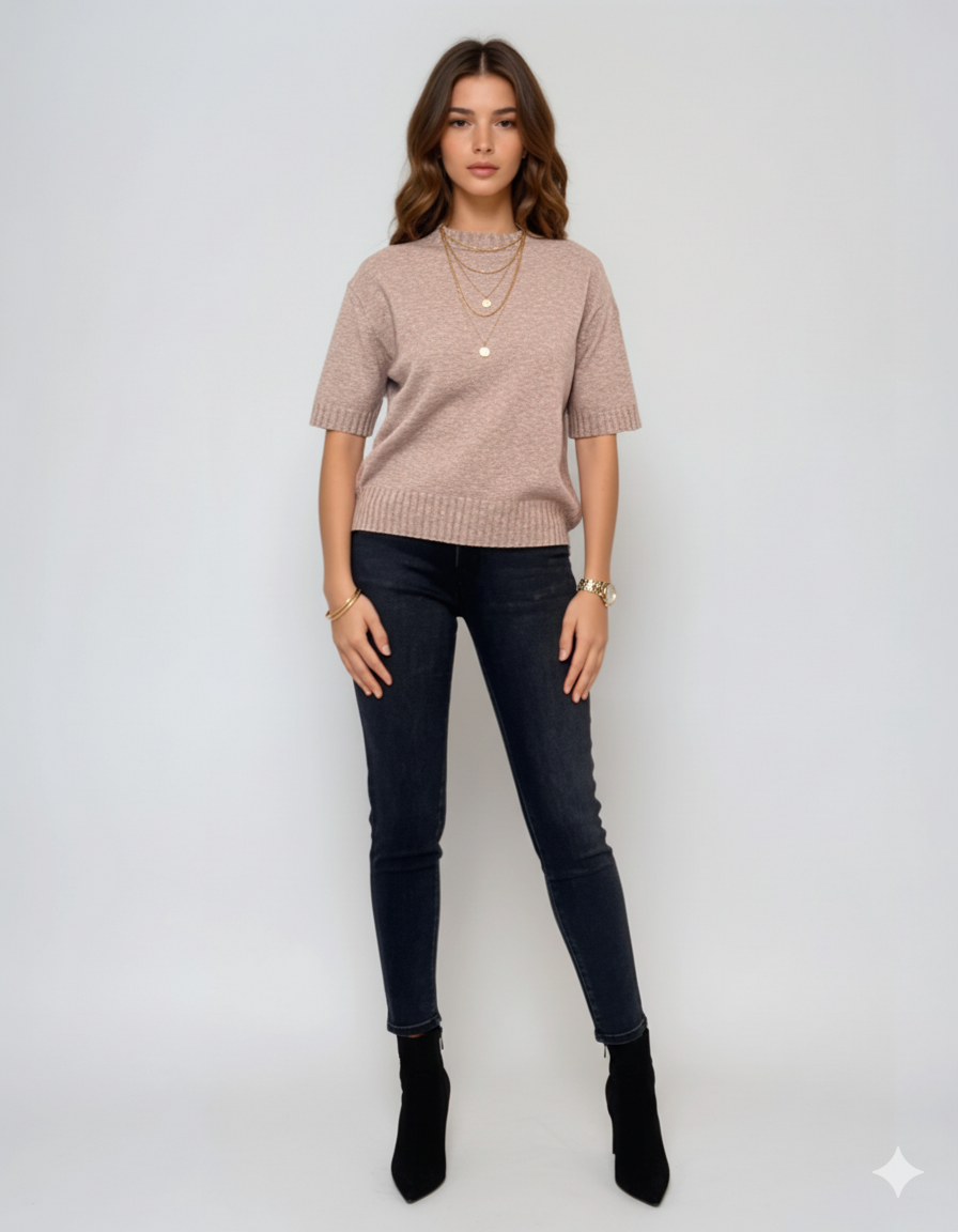 Pulover cu mânecă scurtă și bordură stil pliseu grej aduce echilibru și rafinament oricărei ținute. Nuanța grej este versatilă și modernă, ușor de asortat cu pantaloni sau fuste în tonuri neutre sau pastel.