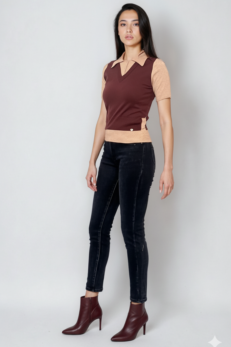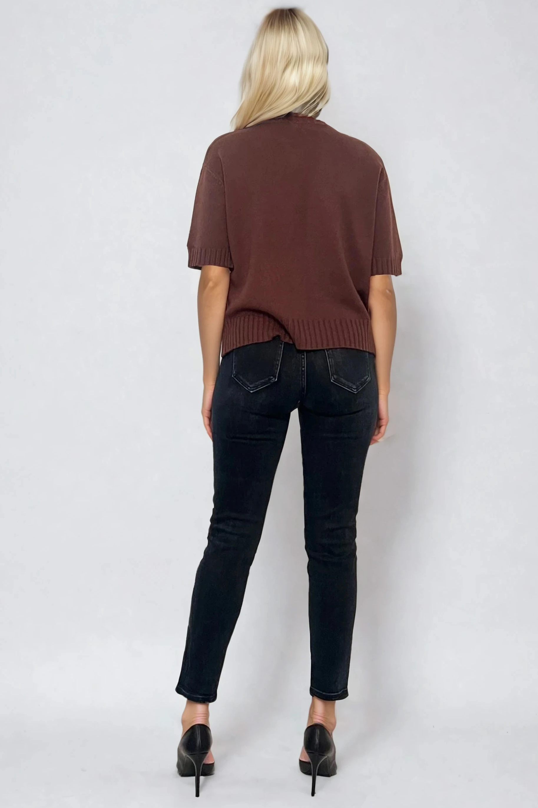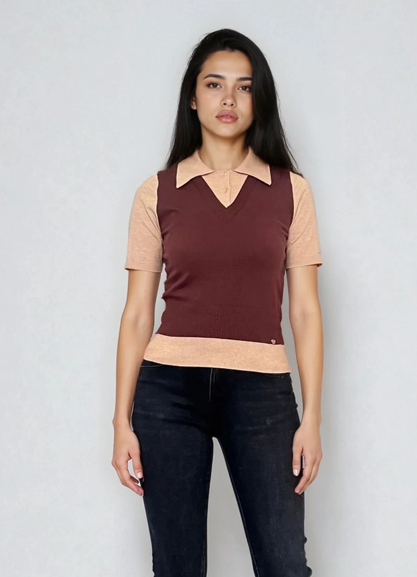 Pulover cu mânecă scurtă, guler cămașă și nasturi maro