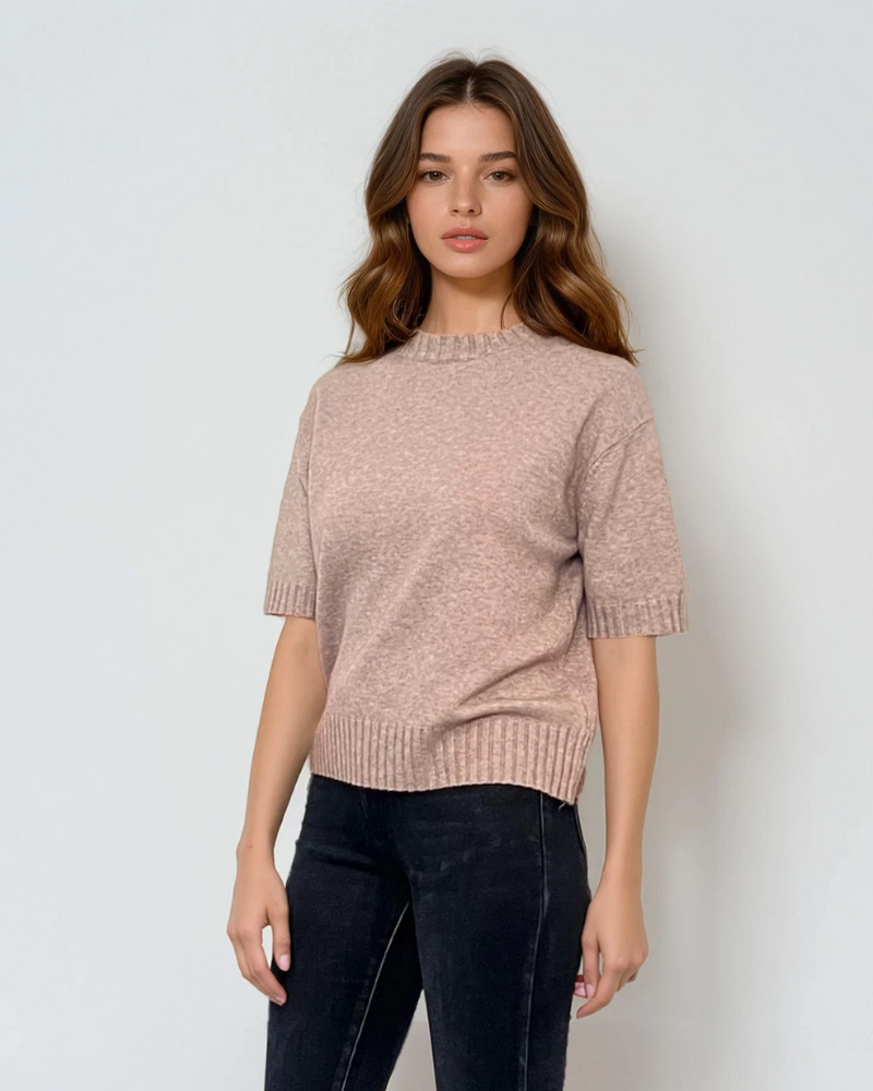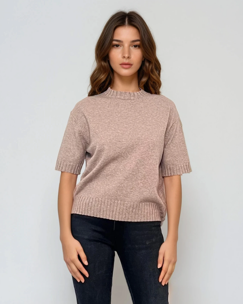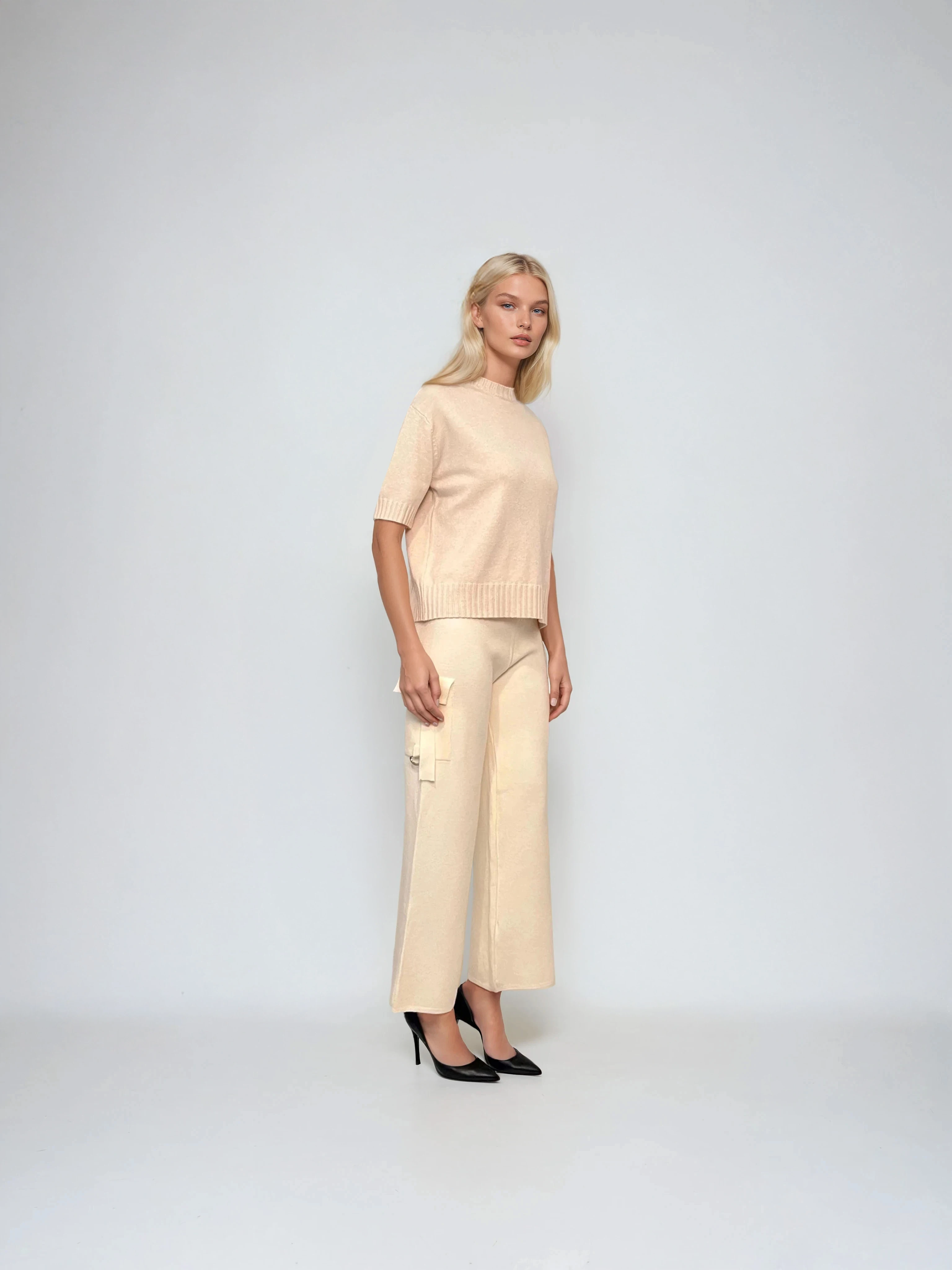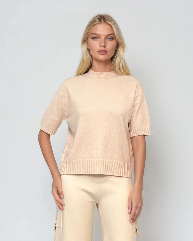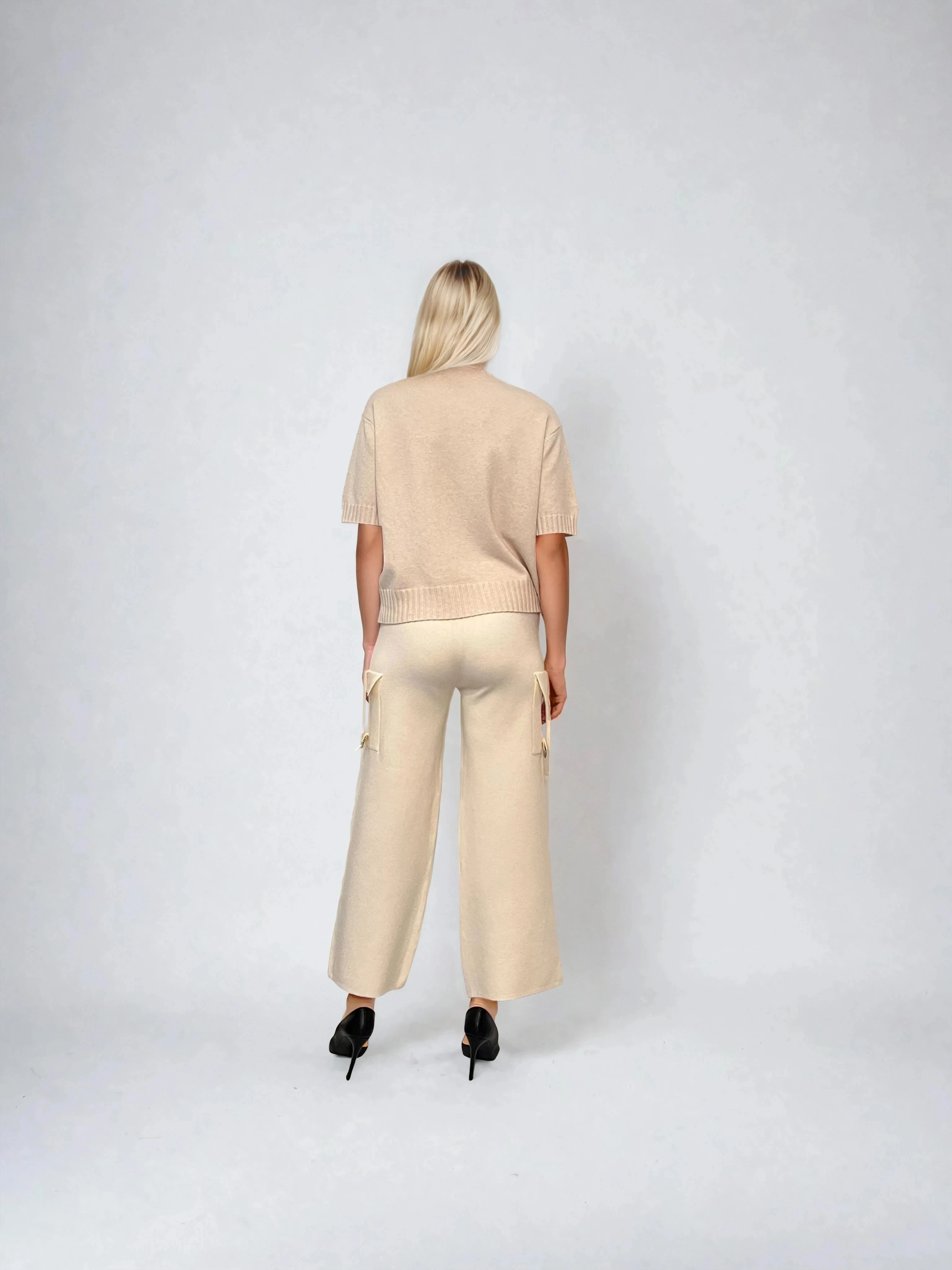 Pulover cu mânecă scurtă, guler cămașă și nasturi beige