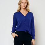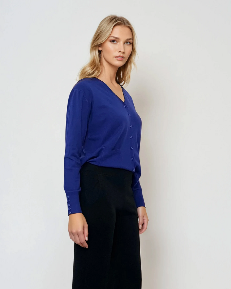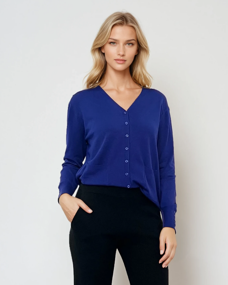 Jachetă cu buzunare și nasturi albastră, cu decolteu în V, este alegerea perfectă pentru un look clasic, dar actual. Nuanța intensă de albastru conferă eleganță, păstrând un aer relaxat și urban.