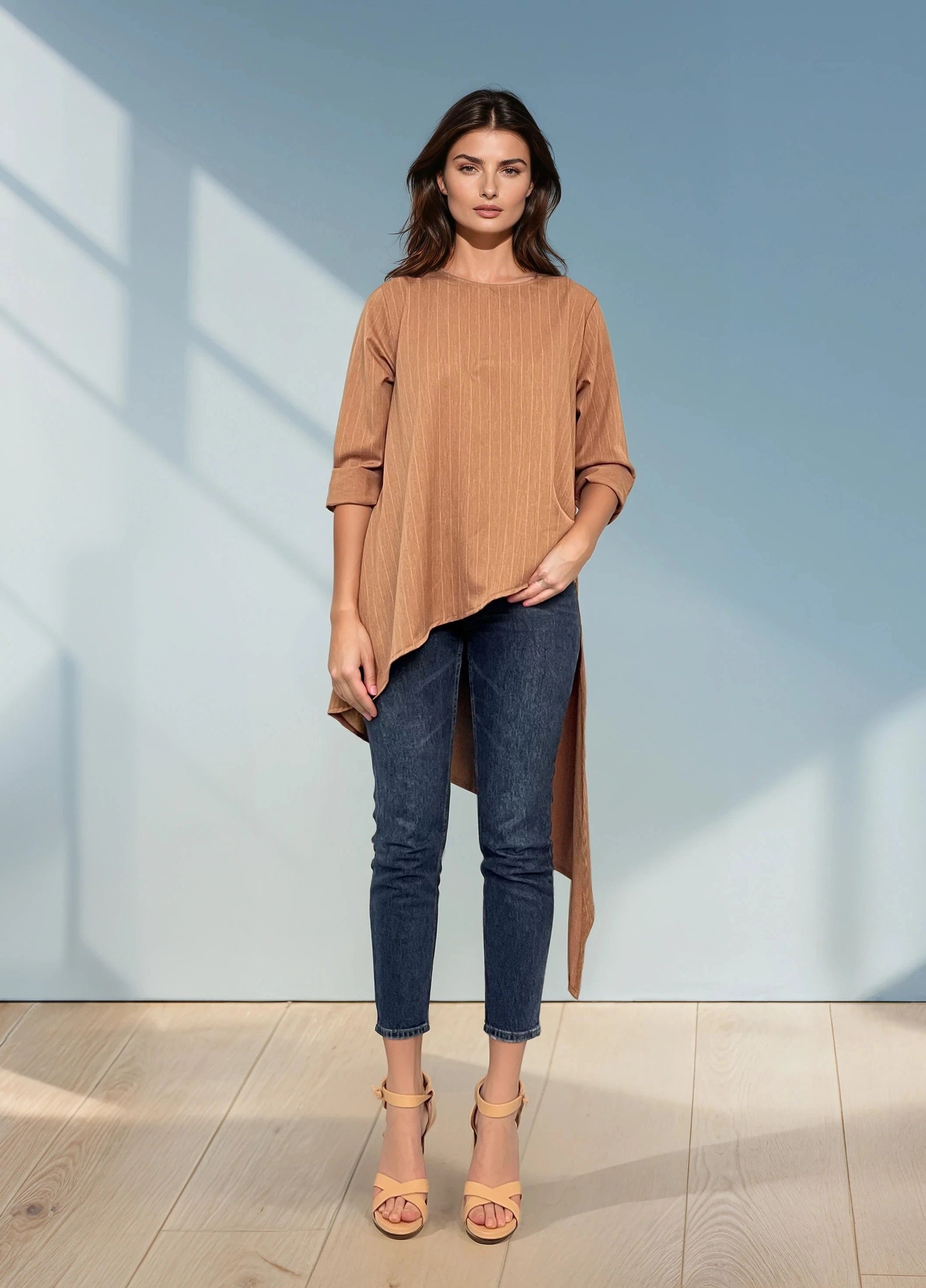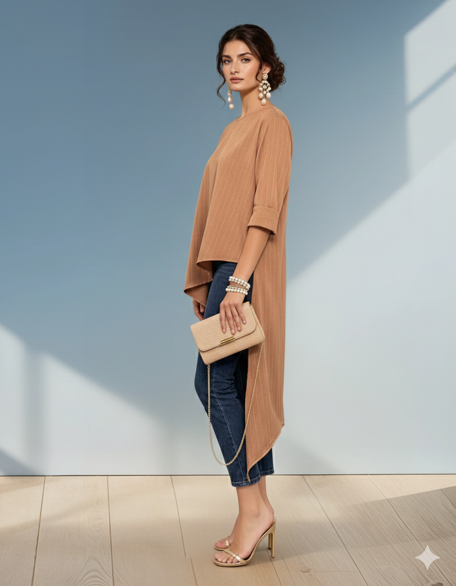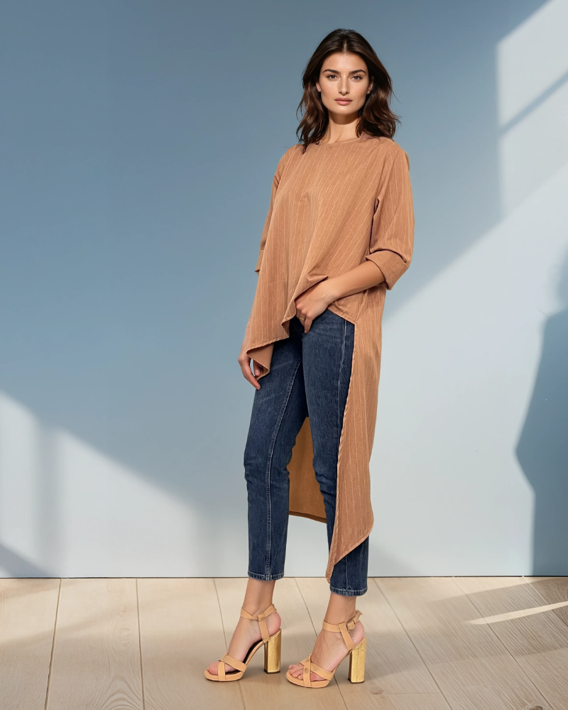 Bluza asimetrică maro cu mânecă lungă și colț mai lung adaugă stil și sofisticare ținutelor de zi sau office. Materialul cu linii subtile oferă un aspect elegant și ușor texturat. Mărime unică S-L, recomandată pentru S, M și L. Modelul are 1.75 m, de aceea partea spate poate părea mai lungă.