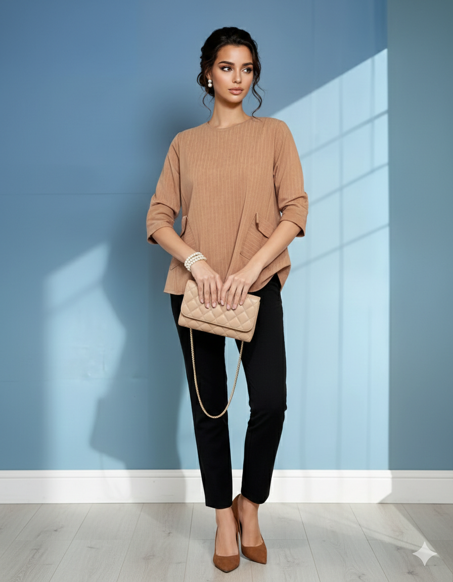 Bluză largă elegantă din mix de vâscoză cu clapete decorative beige este alegerea ideală pentru un look luminos și rafinat la birou. Designul lejer oferă libertate de mișcare, creând un efect oversized pentru S și o purtare confortabilă pentru M și L.
