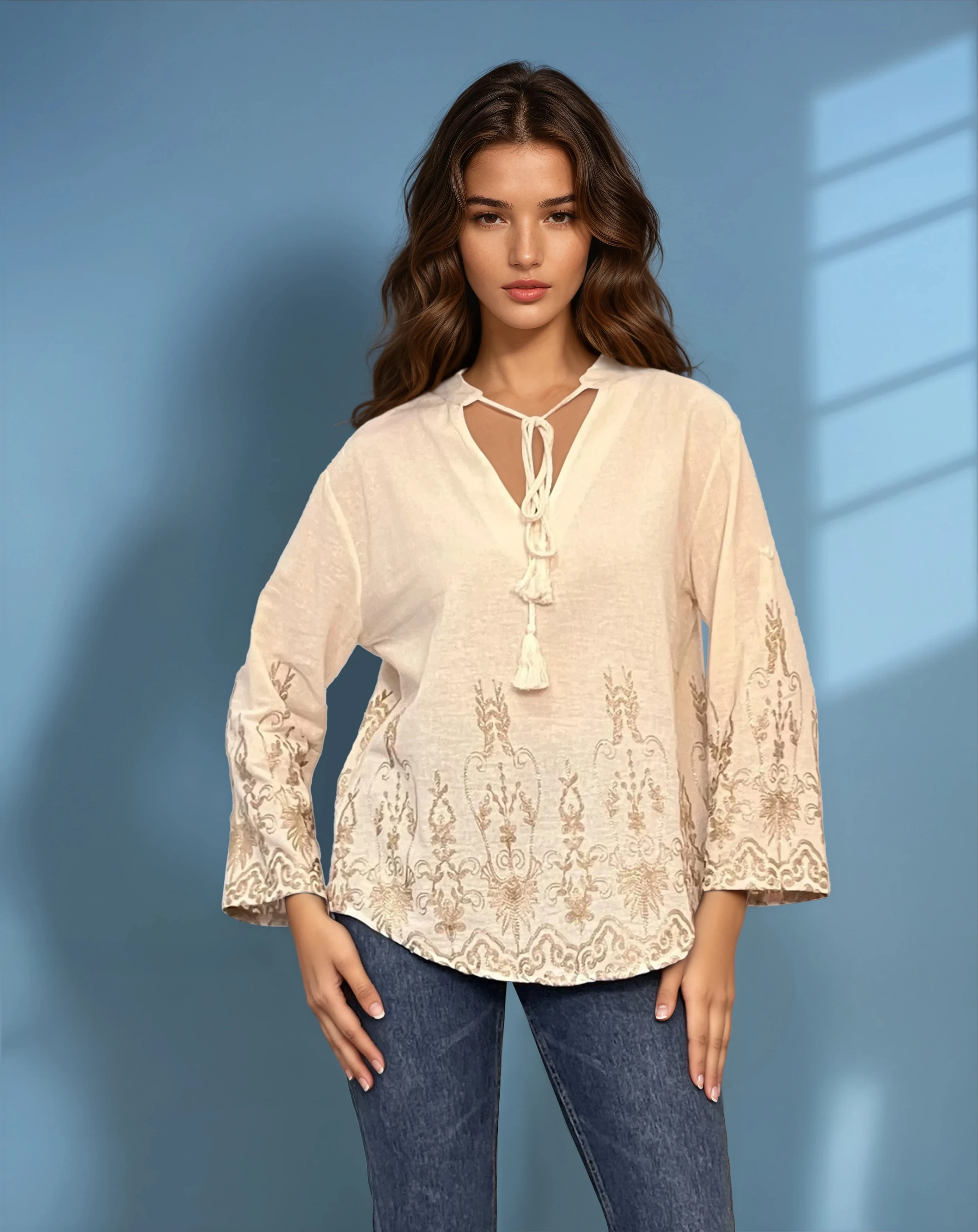 Bluză tip ie din bumbac cu broderie aurie și mânecă lungă crem completează perfect ținutele feminine cu influențe tradiționale. Materialul ușor de călcat și croiala relaxată o fac potrivită pentru purtare zilnică sau ocazii casual rafinate.