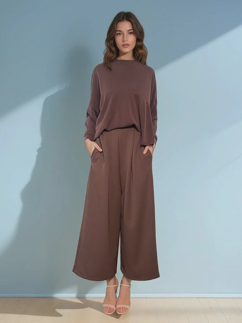 Fustă pantaloni cu pense și buzunare maro impresionează prin eleganța discretă și croiala amplă, ideală pentru ținute smart-casual sau combinații office moderne. Pensele evidențiază talia și creează un efect vizual armonios.