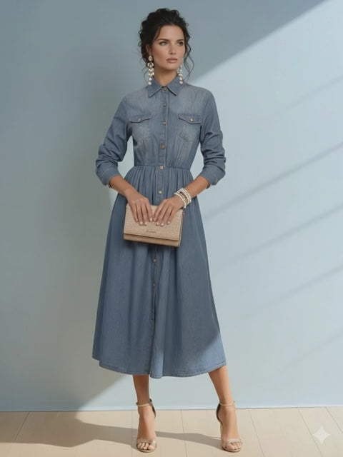 Rochie jeans cu buzunare la piept și curea, mânecă lungă albastru jeans este o piesă versatilă, perfectă pentru un look casual modern, cu influențe utilitare. Designul cu nasturi pe partea frontală oferă un aer lejer și permite ajustarea decolteului în funcție de preferință.