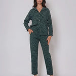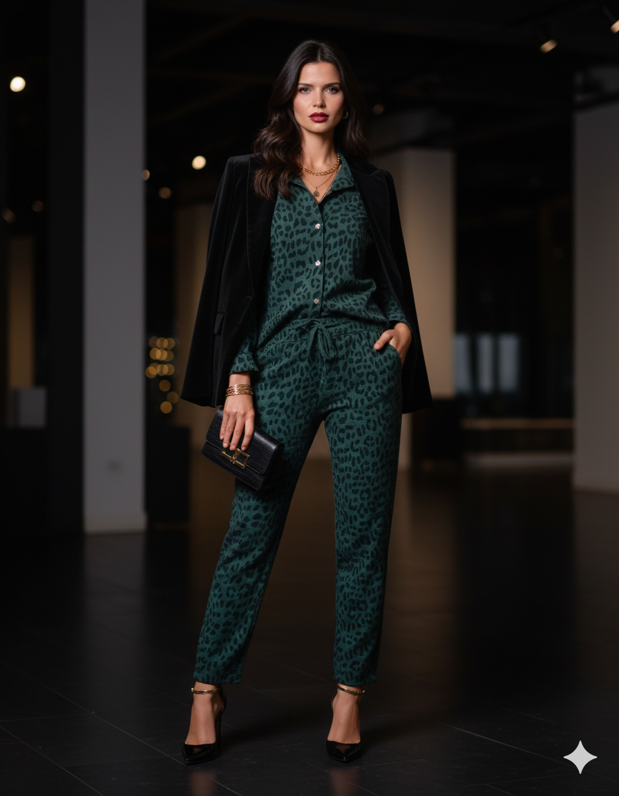 Compleu din raiat animal print verde, o alegere curajoasă și stilată pentru femeia care iubește mixul între comoditate și atitudine. Cămașa oversized cu nasturi oferă un aer relaxat, în timp ce pantalonii cu șiret accentuează talia și permit libertate de mișcare.