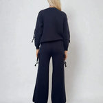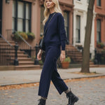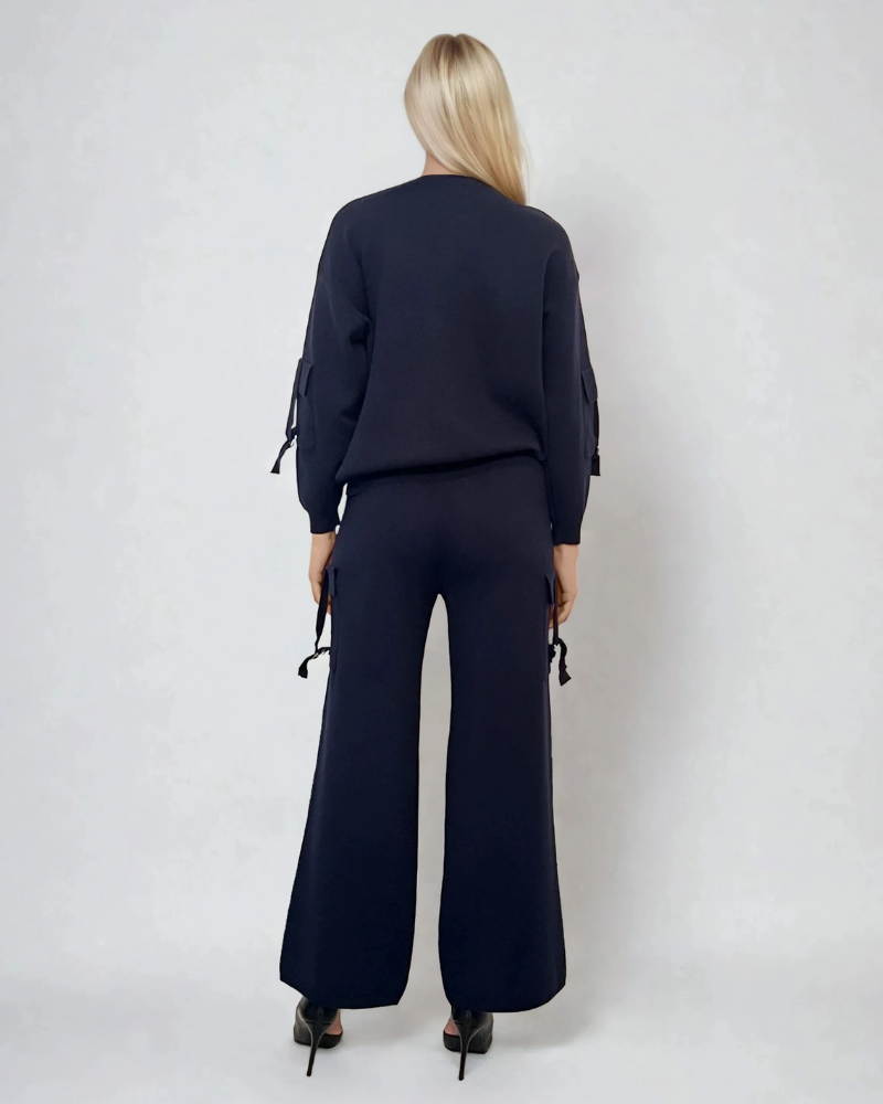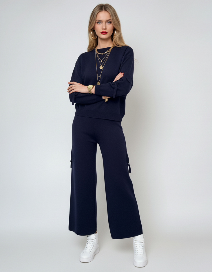 Compleu bleumarin tricotat, cu pantaloni și bluză decorată cu buzunare prevăzute cu cataramă. Designul lejer și elegant îl face potrivit atât pentru ținute de zi, cât și pentru momente de relaxare acasă.