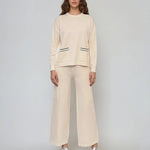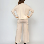 Compleu alb tricotat, format din pulover lejer și pantaloni evazați, cu buzunare aplicate pentru un plus de funcționalitate. Ideal pentru zile relaxate, acest set oferă echilibru între stil și confort.
