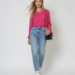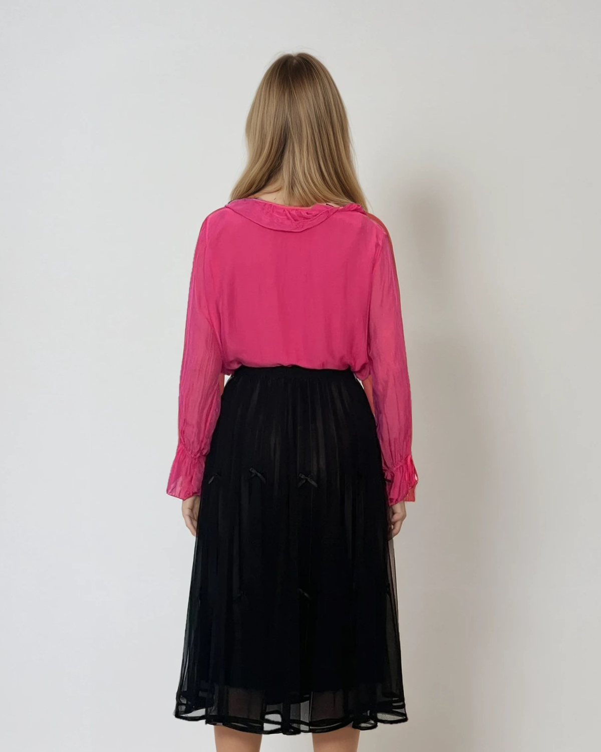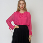 Bluza cu volan din mătase naturală și vascoză ciclam impresionează prin materialul fluid, elegant și feminin, perfectă pentru ocazii speciale sau ieșiri casual. Mâneca lungă și croiala lejeră adaugă un plus de rafinament și confort. Combină această bluză cu fuste din tulle sau blugi, în funcție de eveniment.