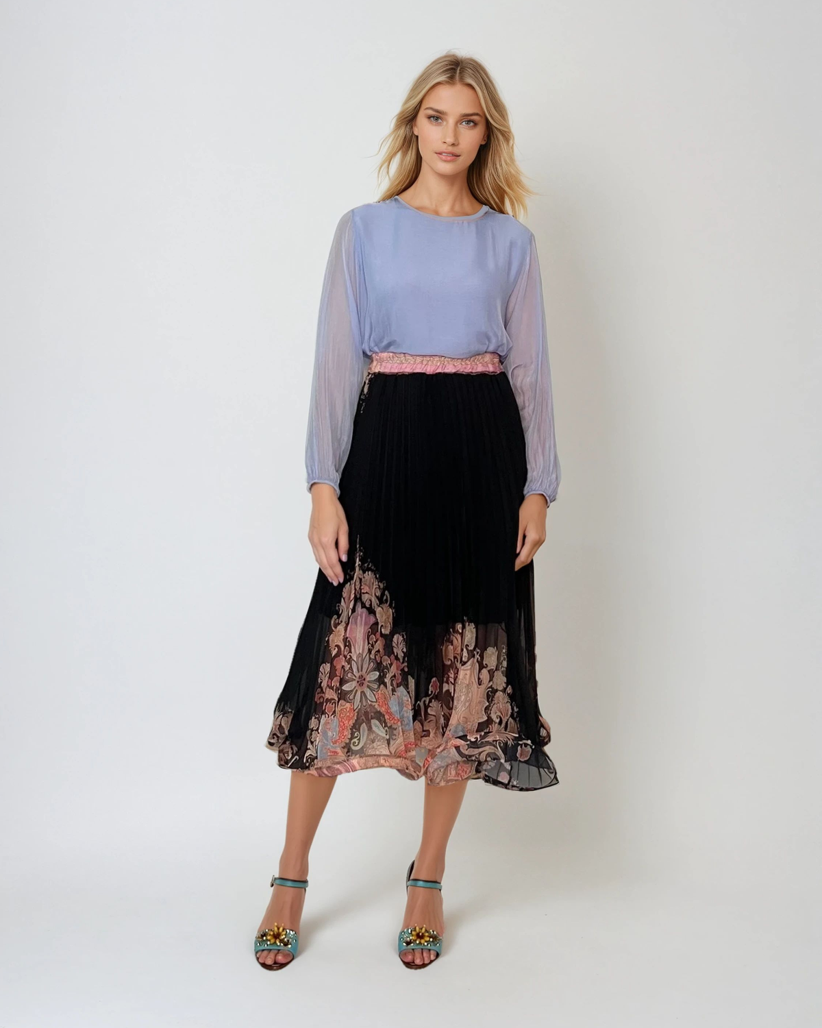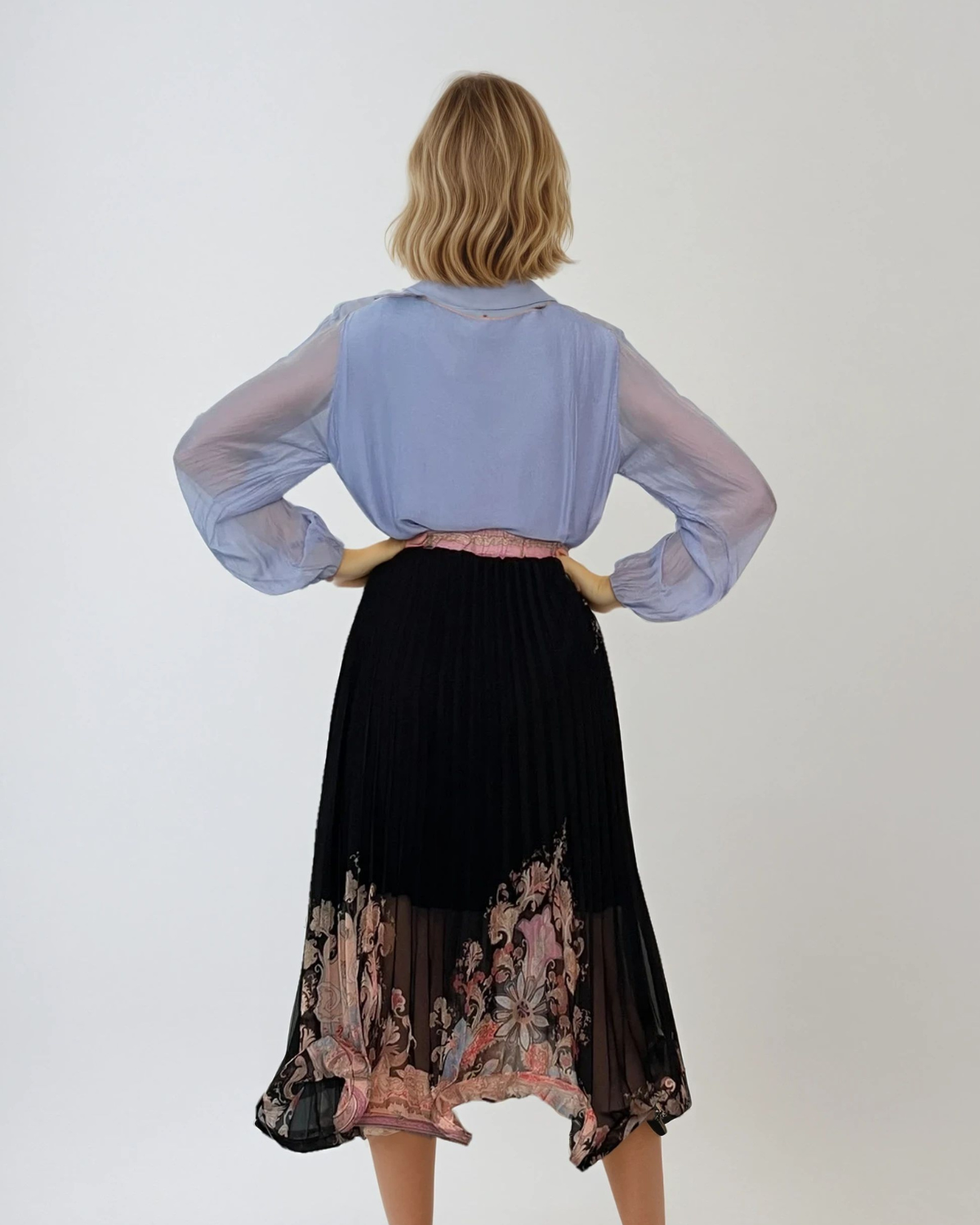 Bluză fluidă din mătase naturală și vascoză bleu, cu un aspect lejer și sofisticat. Croiala amplă și textura moale pun în valoare feminitatea, fiind ideală pentru un styling de zi sau seară. Asorteaz-o cu o fustă elegantă sau jeansi pentru un look fără efort.