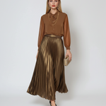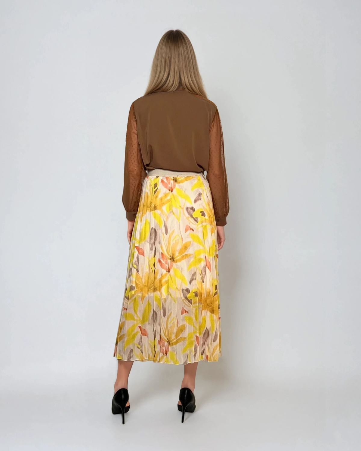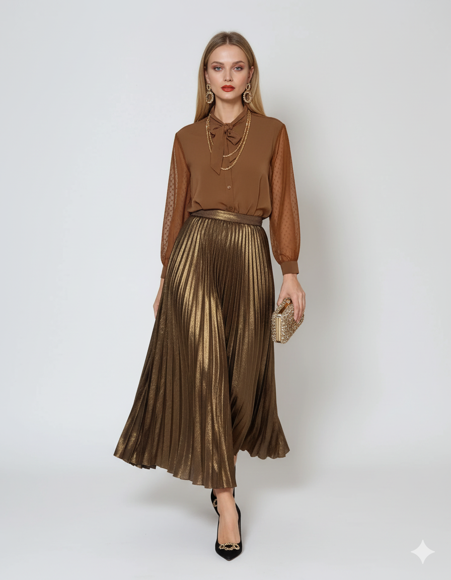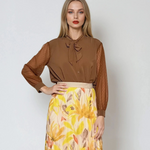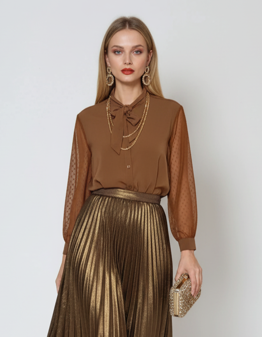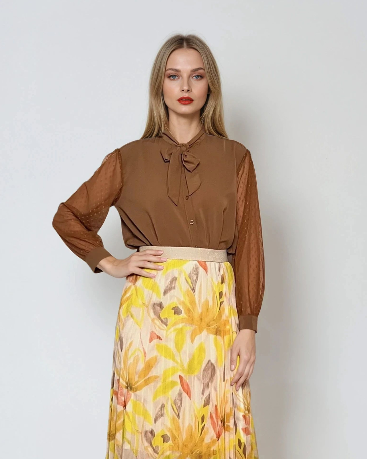 Bluza din voal beige, cu mâneci lungi din tulle decorat cu polka dots, este o piesă elegantă și versatilă. Nasturii și eșarfele subtiri de la gât permit multiple moduri de asortare, fiind perfectă pentru combinații cu fuste din tulle sau blugi pentru un look de seară casual-elegant.