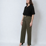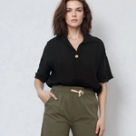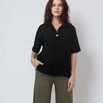 Cămașă lejeră din in cu nasture mare negru, ideală pentru ținute de zi și outfituri office. Croiul relaxat și mânecile scurte oferă confort sporit și libertate de mișcare. Materialul natural permite pielii să respire, iar nasturele supradimensionat adaugă o notă modernă și minimalistă. Se potrivește perfect cu pantaloni largi sau fuste din in pentru un look echilibrat și fresh, atât la birou, cât și în timpul liber.