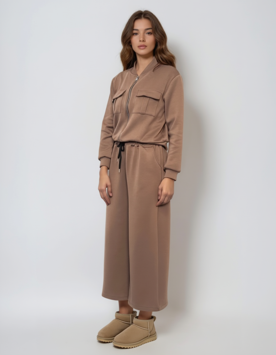 Fustă pantalon grej cu buzunare și șnur, o alegere versatilă pentru orice garderobă casual. Materialul plăcut la atingere și designul practic cu buzunare fac această piesă perfectă pentru activitățile zilnice.