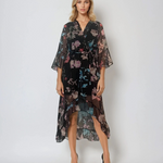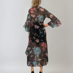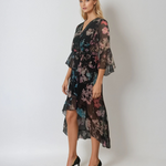 Rochie asimetrică neagră din voal cu print floral, elegantă și rafinată, perfectă pentru evenimente de seară. Mânecile 3/4 tip clopot și croiala fluidă adaugă feminitate, iar cordonul în talie permite ajustarea pe corp.
