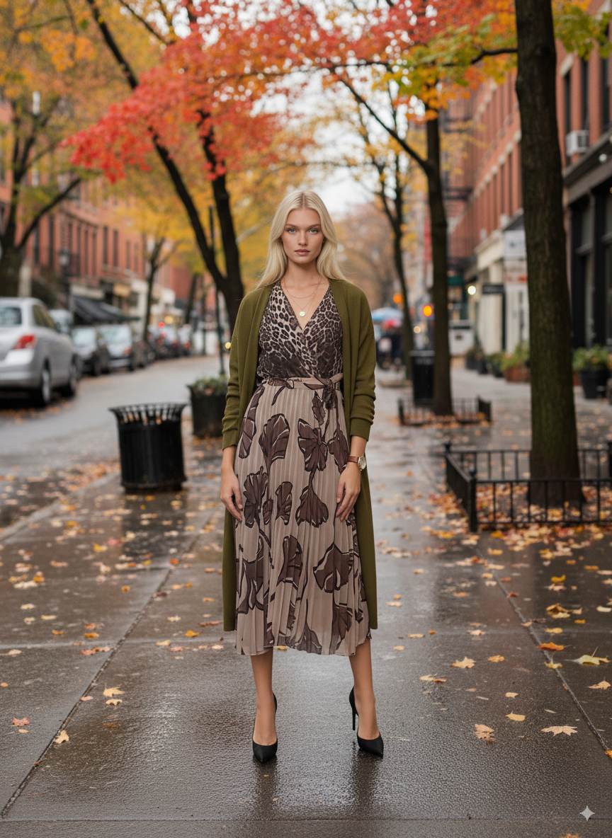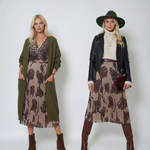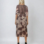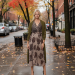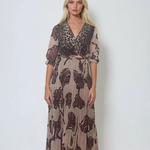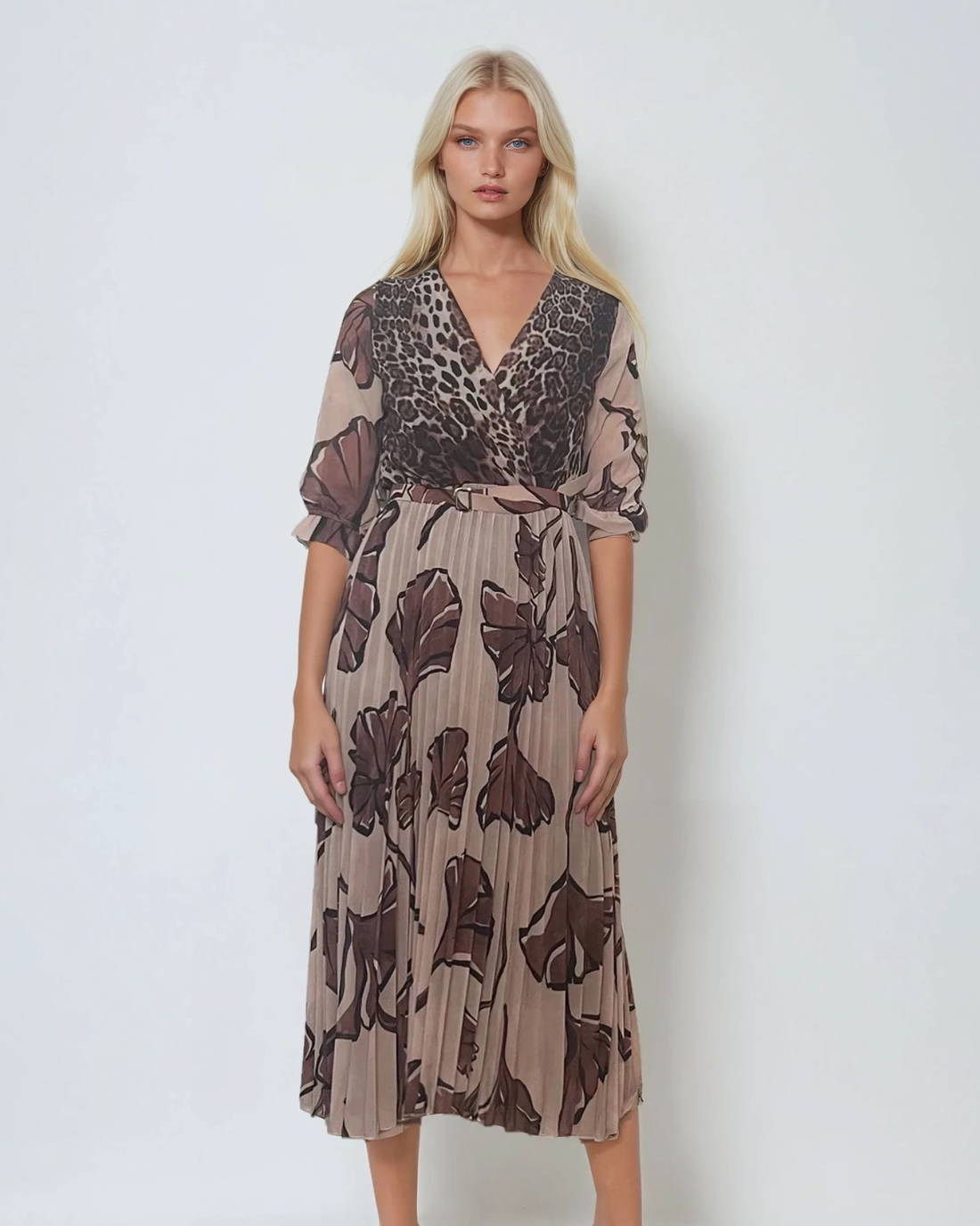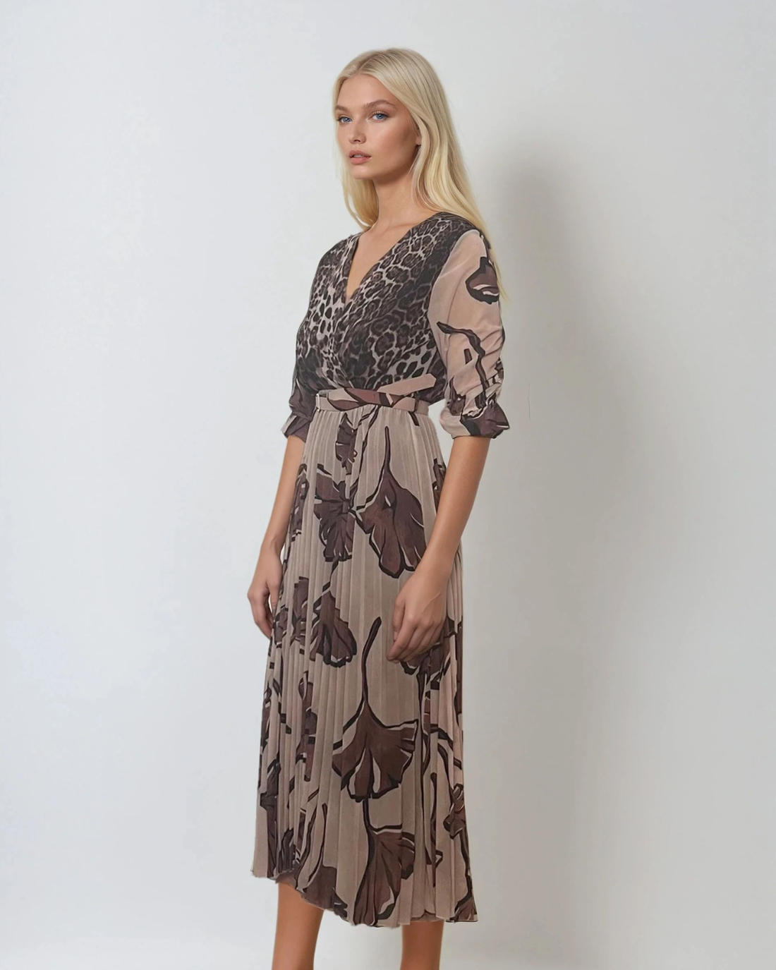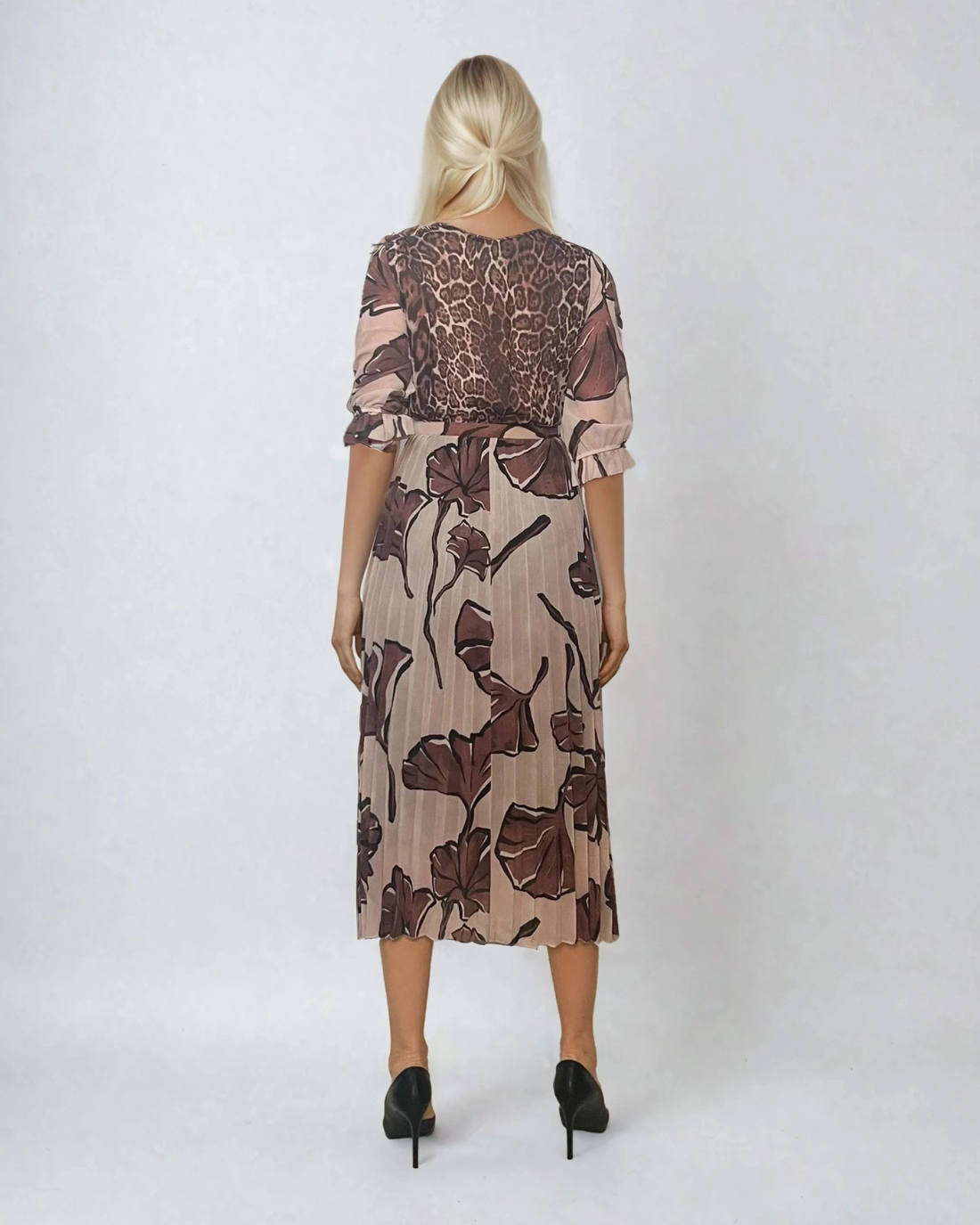 Rochie lungă cu imprimeu, decolteu adânc și plisată beige, ce combină animal print subtil pe bust și spate cu o fustă vaporoasă plisată. Cureaua din același material oferă o talie bine definită, iar croiala largă asigură confortul în orice ocazie.