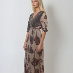 Rochie lungă cu imprimeu, decolteu adânc și plisată beige