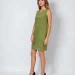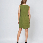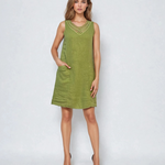 Rochie de vară din in vernil fără mâneci cu guler paiete combină o nuanță fresh cu un design elegant. Croiala lejeră oferă confort, iar gulerul cu paiete adaugă un accent strălucitor, ideal pentru momente speciale sau plimbări relaxate.