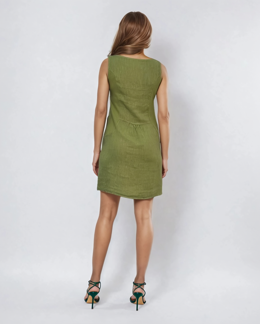 Rochie scurtă fără mâneci cu nasturi vernil este ideală pentru un look fresh și natural, perfectă pentru zilele calde. Croiala fără mâneci oferă confort maxim, iar nasturii adaugă un accent elegant și feminin.
