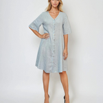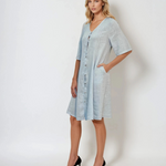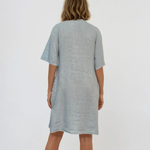 Rochie din in largă cu buzunare și nasturi bleu combină confortul și stilul într-o nuanță delicată, ideală pentru zilele însorite. Croiala lejeră și buzunarele practice fac din această rochie o alegere funcțională și elegantă.