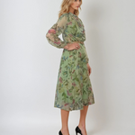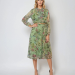 Rochie midi verde din voal cu print floral în nuanțe naturale, perfectă pentru petreceri în aer liber sau evenimente casual-chic. Cureaua accentuează talia, iar eșarfa poate fi legată la gât sau lăsată liberă pentru un aer lejer.