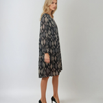 Rochie midi lejeră cu print și decolteu în V neagră aduce un plus de eleganță și rafinament oricărei garderobe. Realizată din material vaporos cu 50% vâscoză, piesa oferă libertate de mișcare și o senzație plăcută la purtare. Mâneca lungă cu detaliu și imprimeul discret completează perfect un look modern.