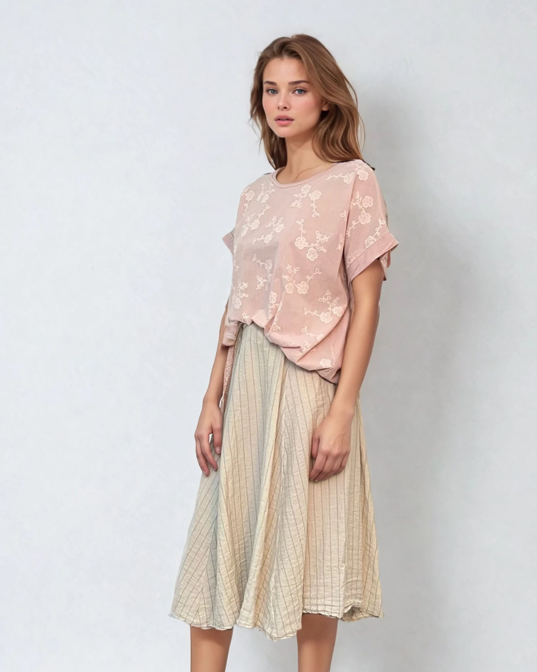 Tricou cu broderie rustica pe maneca si decolteu alb