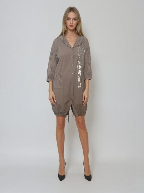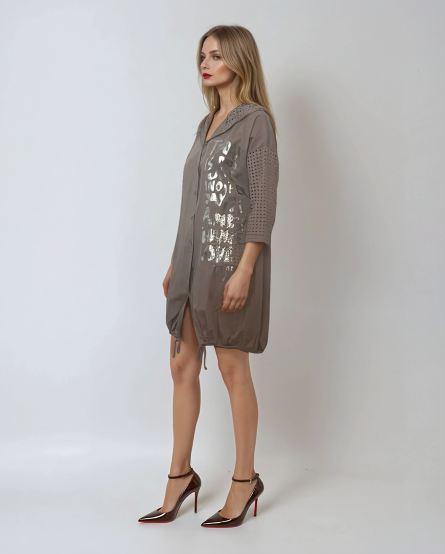 Rochie scurtă tip hanorac cu glugă croșetată și print floral grej