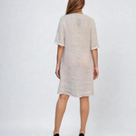 Rochie din in largă cu buzunare și nasturi alb oferă un look fresh și confortabil, perfect pentru zilele călduroase de vară. Croiala lejeră și buzunarele practice adaugă funcționalitate, în timp ce nasturii dau un plus de stil și eleganță.
