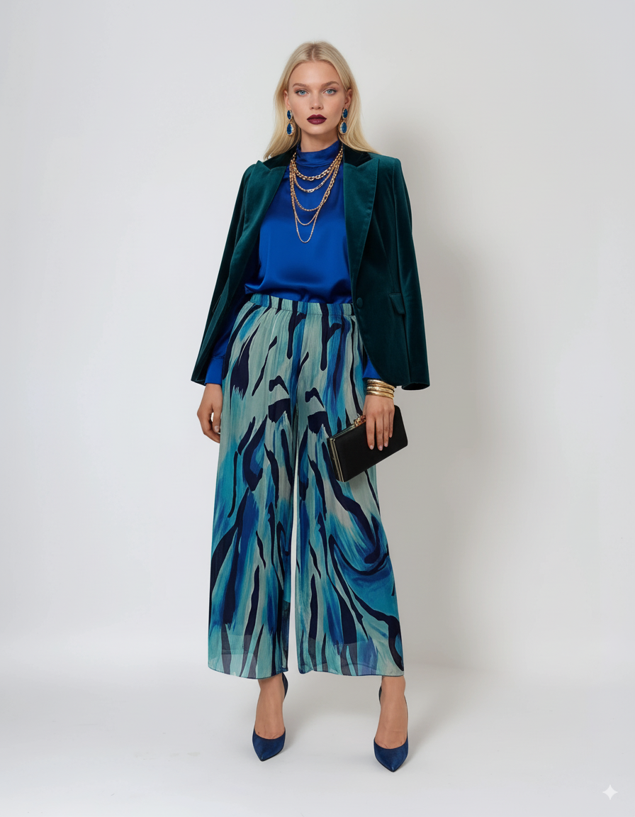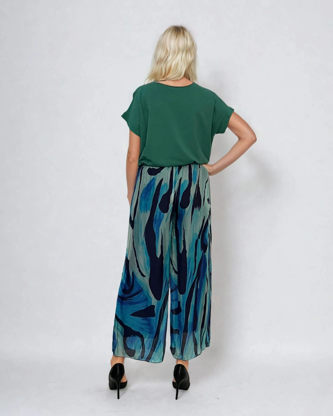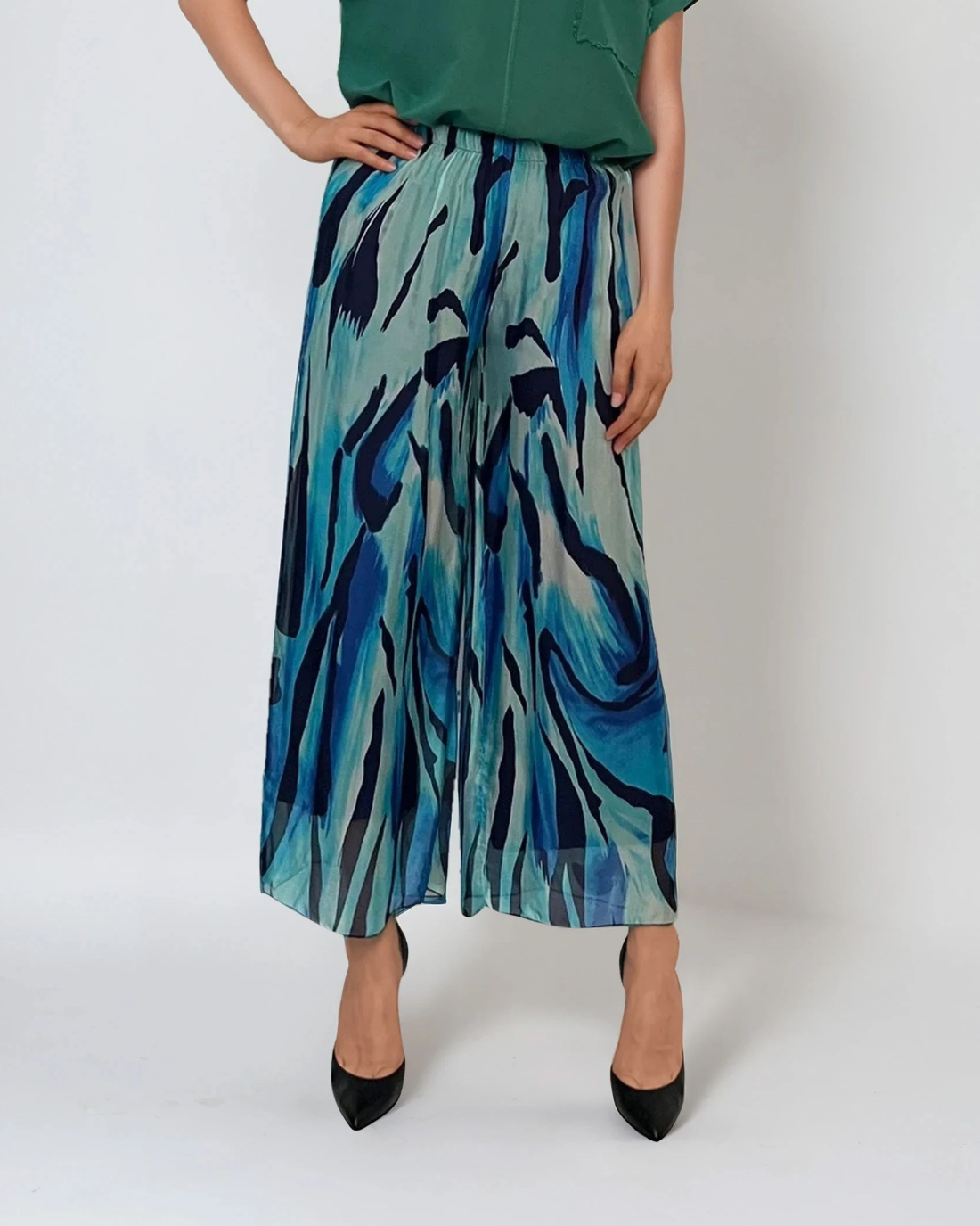 Fustă pantaloni din mătase bleu este o piesă vaporoasă și ușor de purtat, perfectă pentru zilele însorite sau vacanțele de vară. Croiala amplă și materialul diafan oferă libertate de mișcare, iar nuanța bleu adaugă o notă proaspătă și relaxată.