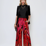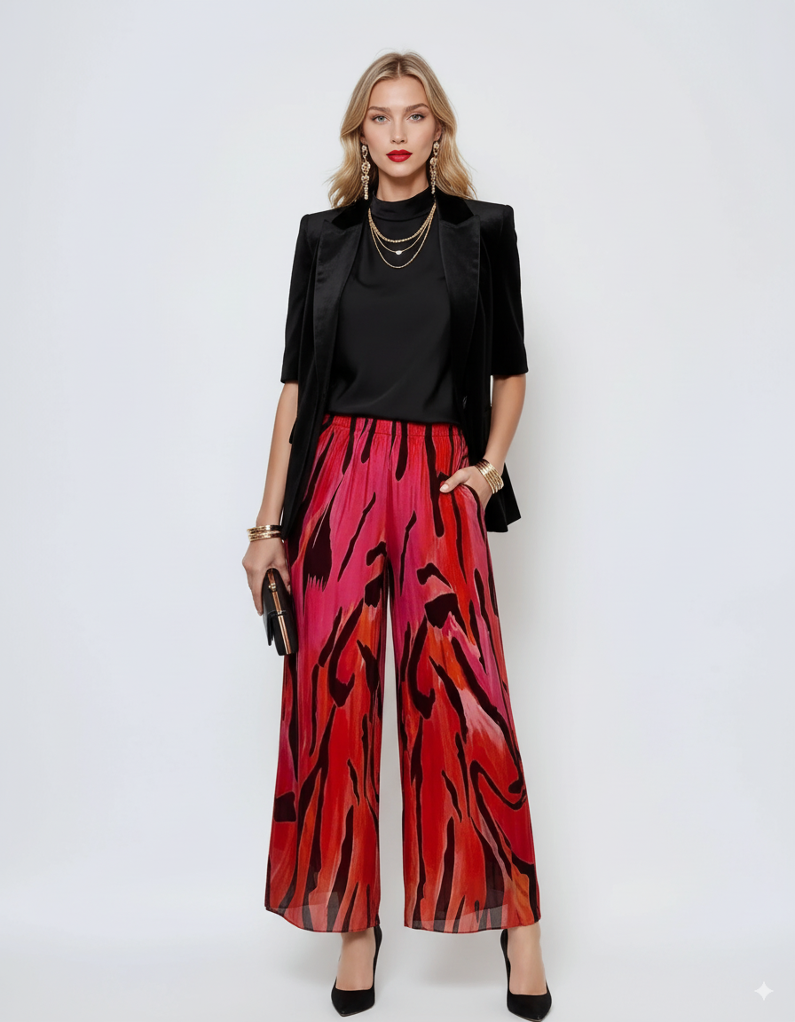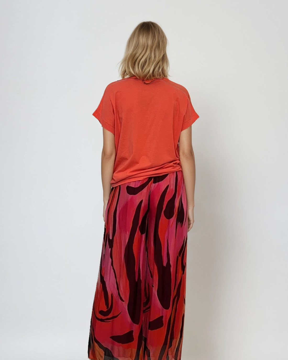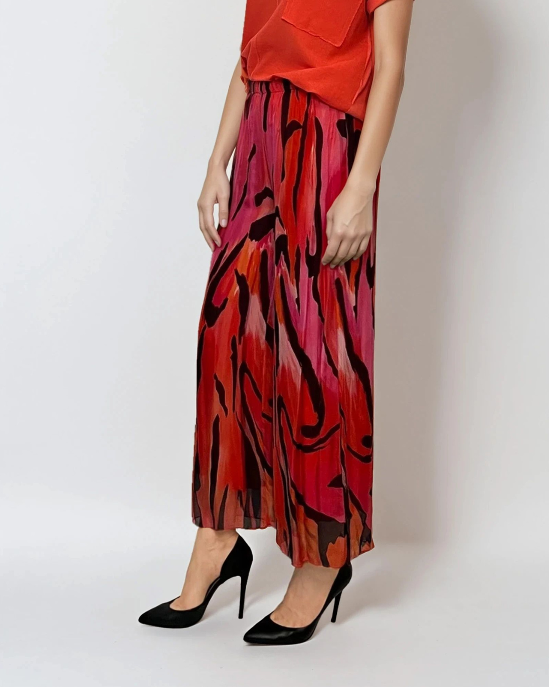 Fustă pantaloni din mătase roz oferă un echilibru perfect între stil feminin și confort absolut. Cu un design amplu și vaporos, această piesă aduce libertate de mișcare și o notă romantică oricărei ținute.