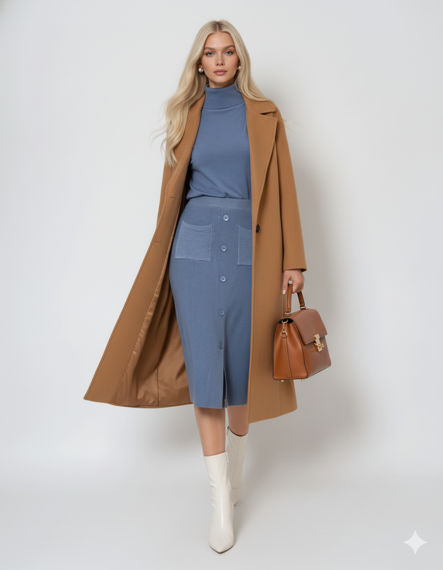 Fustă midi tricotată cu buzunare albastru-jeans
