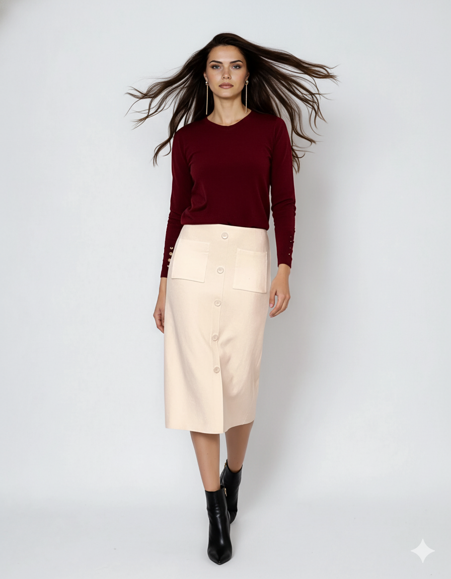Fustă tricotată clos cu nasturi grena