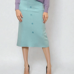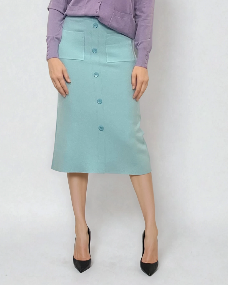 Fustă midi tricotată cu buzunare aqua atrage prin nuanța sa vibrantă și croiala practică. Buzunarele laterale și tricotul moale o fac comodă pentru întreaga zi, iar nasturii mari adaugă un accent stylish.