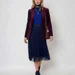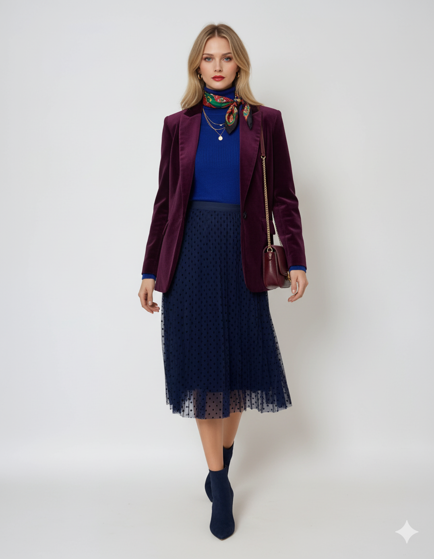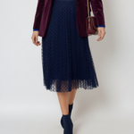 Fustă din tulle cu buline mici bleumarin adaugă un strop de romantism oricărei ținute. Textura ușoară și diafană a tulle-ului creează un efect vapuros, în timp ce bulinele fine oferă un aer jucăuș și delicat.