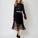 Fustă lungă neagră plisată cu print floral subtil, completată de o crinolină fluidă la bază care adaugă volum și mișcare elegantă. Croiala lejeră și talia elastică oferă confort sporit, fiind ideală pentru ocazii speciale și evenimente festive.