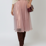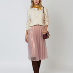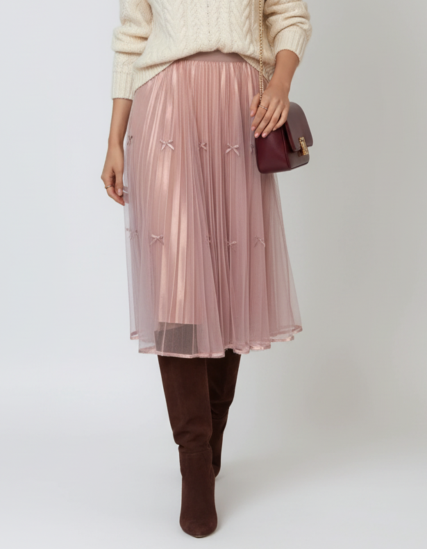 Fustă midi din tulle cu fundițe și aspect satinat roz, ce aduce un aer jucăuș și romantic ținutelor de ocazie. Materialul delicat și croiala vaporosă oferă un plus de feminitate și mișcare plăcută.