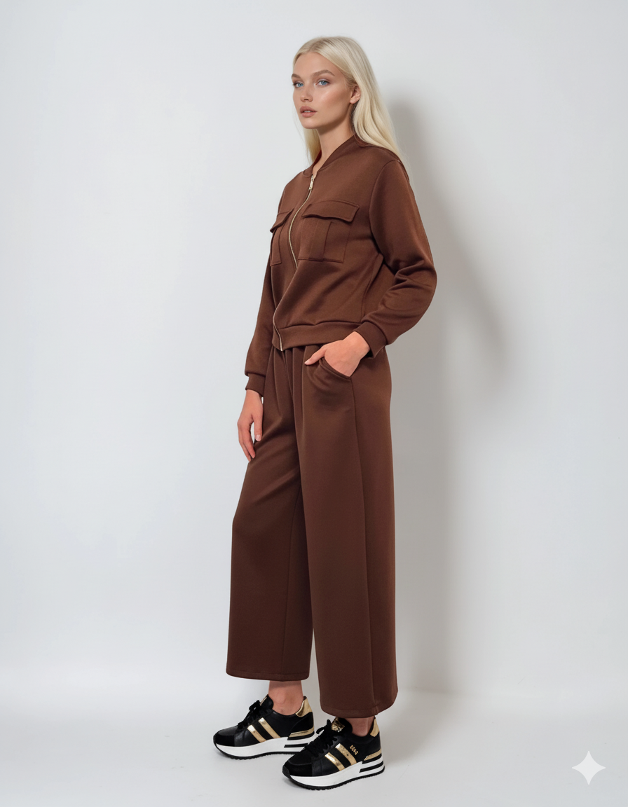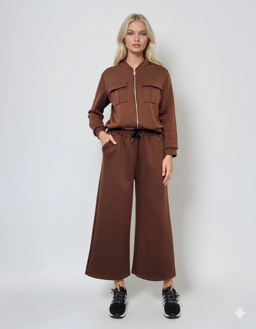 Fustă pantalon maro cu buzunare și șnur, perfectă pentru un look casual și sportiv. Materialul moale și croiala comodă asigură confort pe tot parcursul zilei, iar nuanța naturală completează orice garderobă.