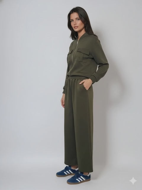 Jachetă kaki cu buzunare și fermoar, ideală pentru ținute casual și relaxate. Culoarea naturală și croiala comodă oferă un plus de confort și stil în orice zi.