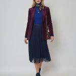 Nuanța de bleumarin este calmă și elegantă, ideală pentru ținute casual sau evenimente de zi. Talia elastică se mulează confortabil pe siluetă, iar lungimea medie o face ușor de purtat cu bluze simple sau cămăși fluide.