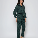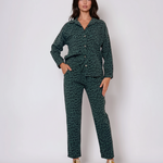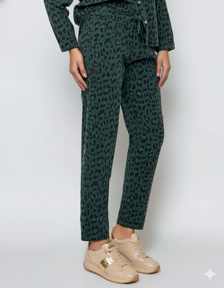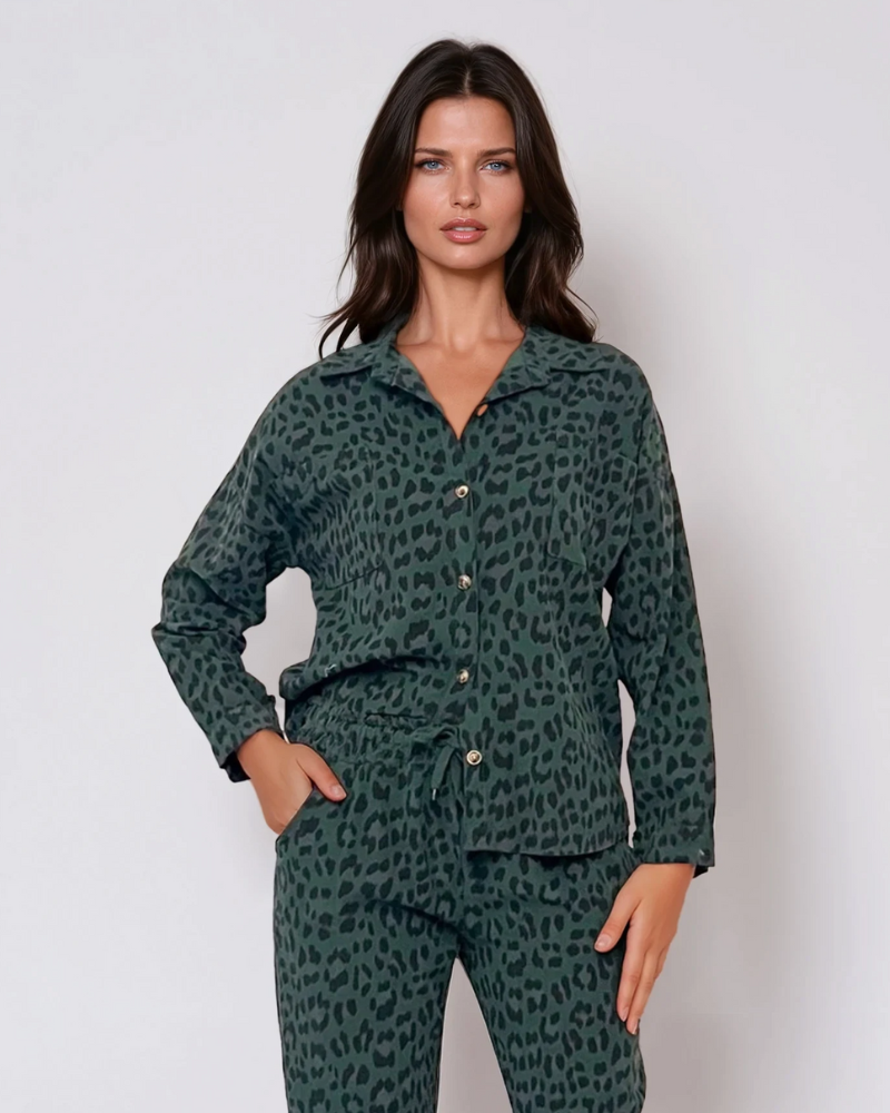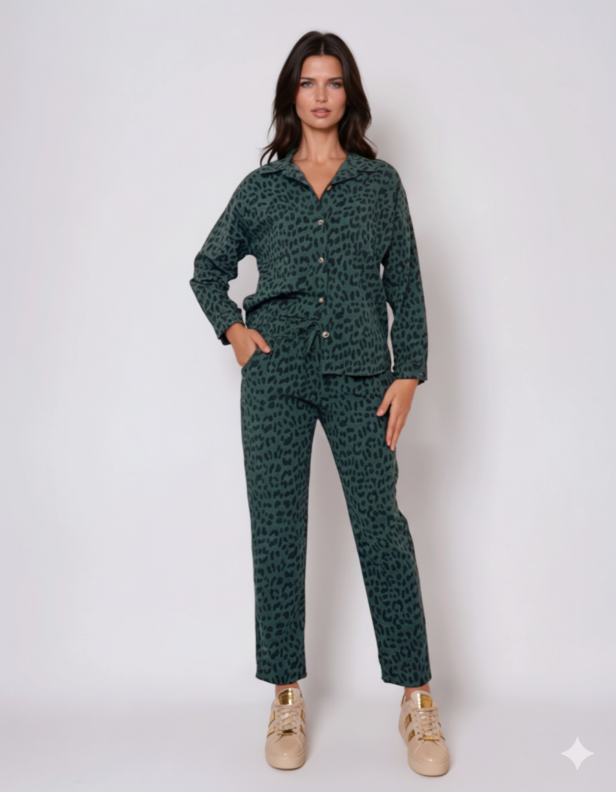 Compleu din raiat animal print verde, o alegere curajoasă și stilată pentru femeia care iubește mixul între comoditate și atitudine. Cămașa oversized cu nasturi oferă un aer relaxat, în timp ce pantalonii cu șiret accentuează talia și permit libertate de mișcare.