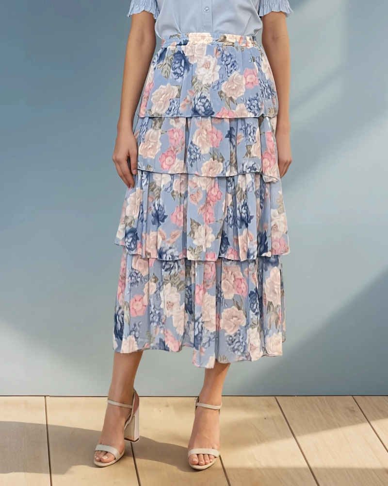 Fustă lungă cu volane și print floral bleu