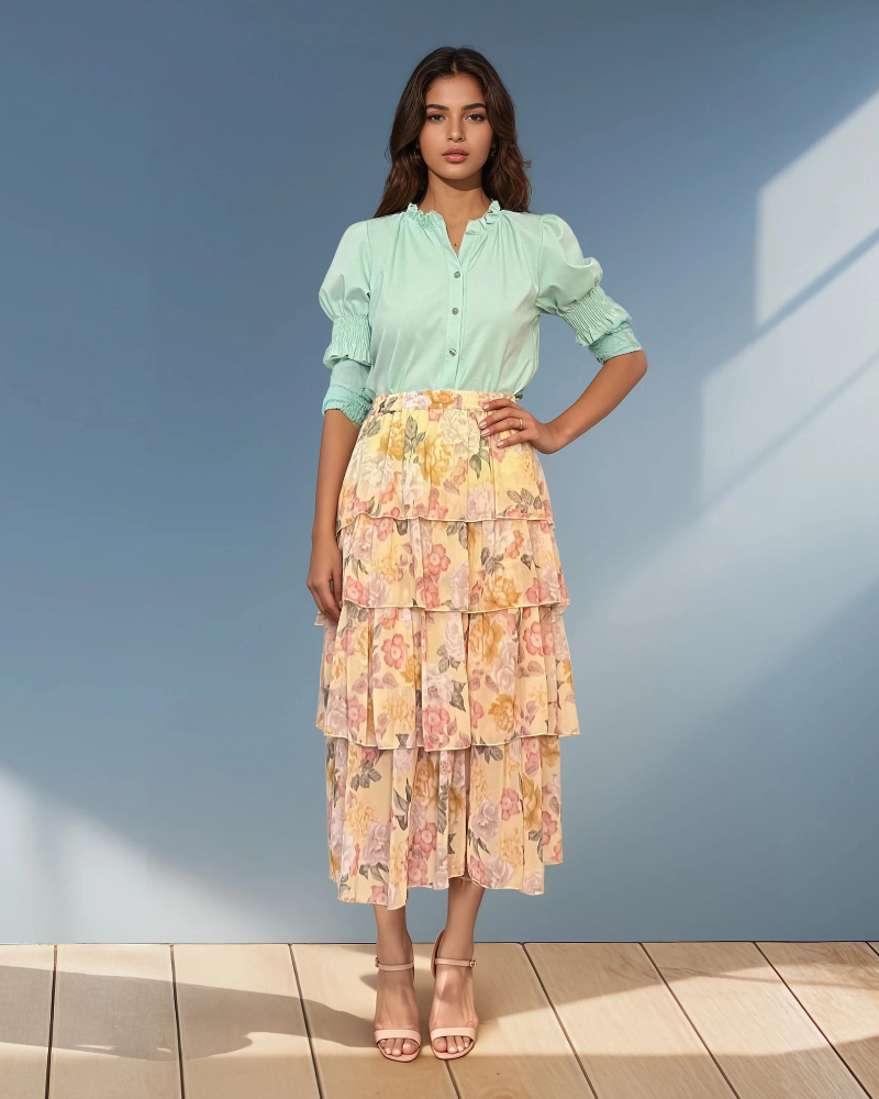 Fustă lungă cu volane și print floral galbenă aduce energie și prospețime ținutelor de sezon. Volanele subtile și imprimeul floral creează un aspect elegant și feminin, potrivit pentru plimbări, evenimente casual sau ținute de zi sofisticate.