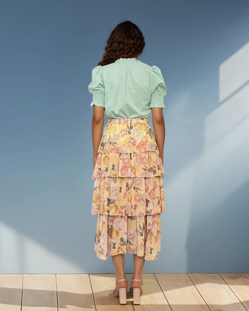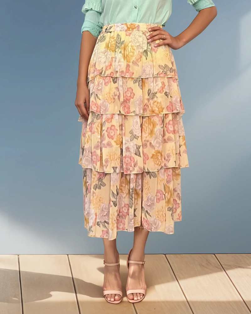 Fustă lungă cu volane și print floral galben