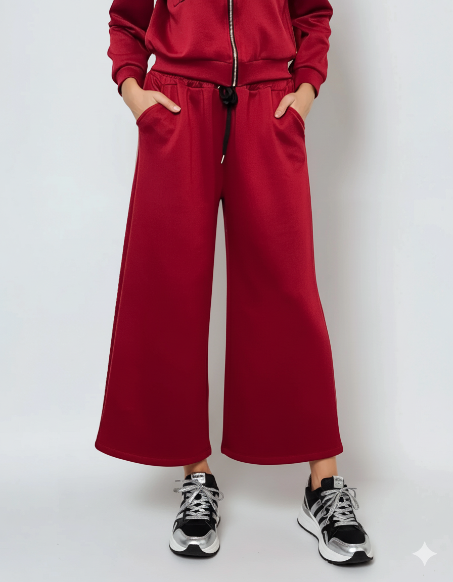 Fustă pantalon grena cu buzunare și șnur, o alegere îndrăzneață și elegantă pentru ținutele casual și sportive. Croiala confortabilă și detaliile practice oferă un plus de funcționalitate și stil.