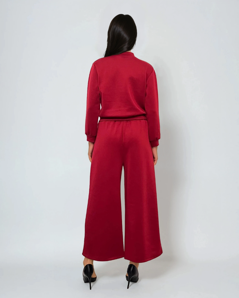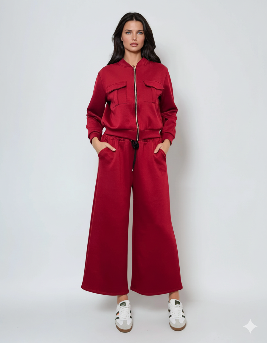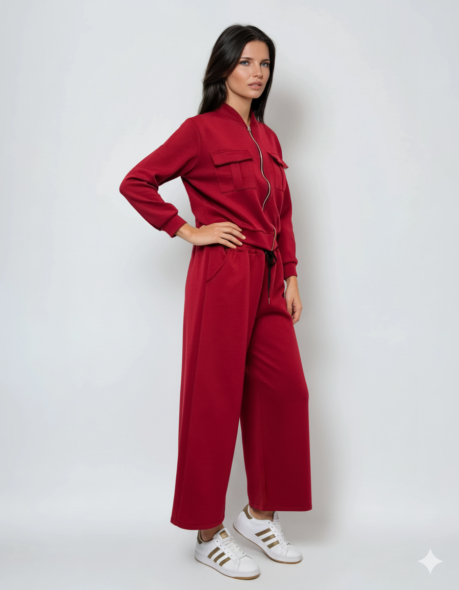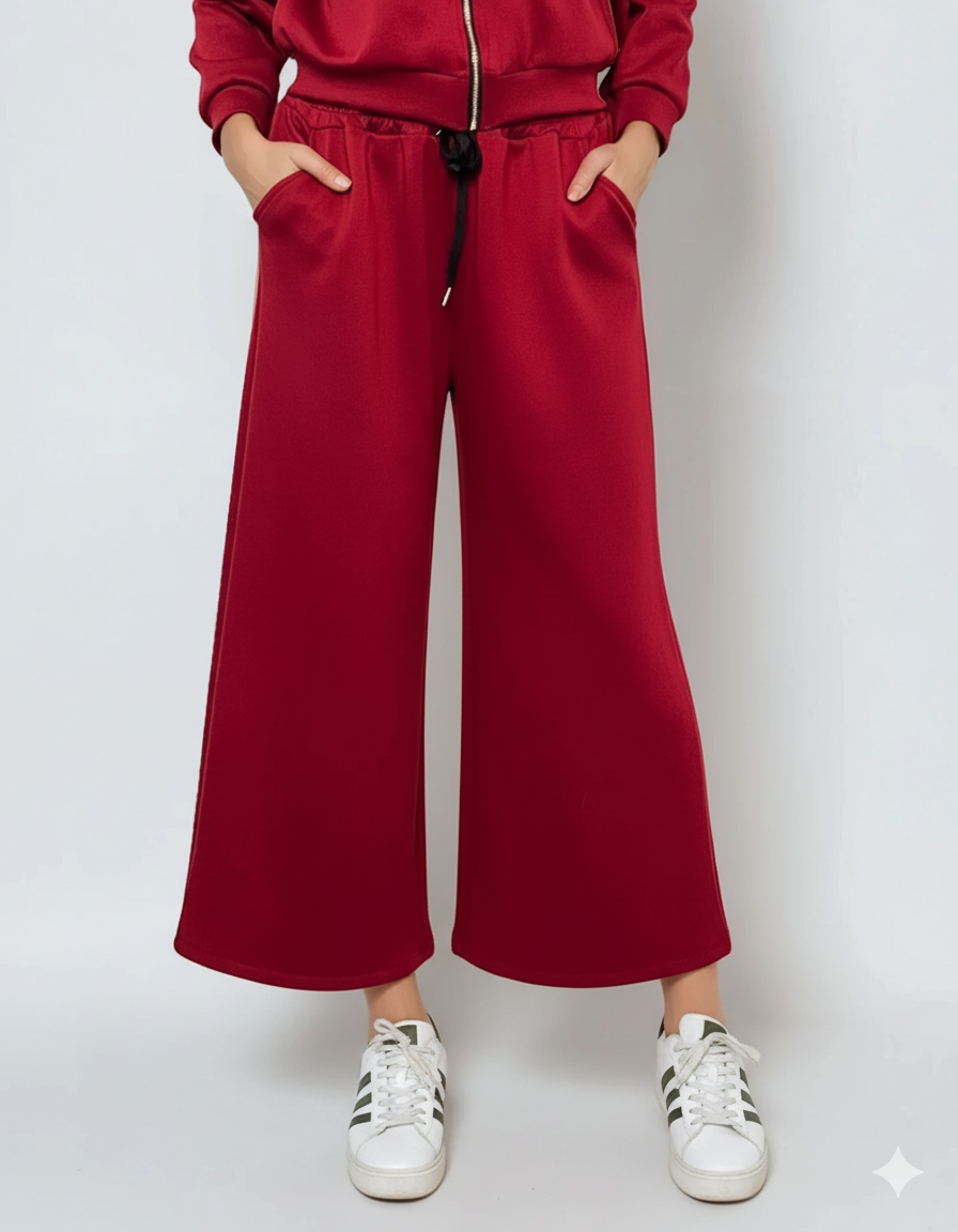 Pantaloni lungi la dungă din vâscoză grena, o alegere chic pentru garderoba ta de zi. Culoarea intensă adaugă personalitate ținutei, iar materialul călduros este perfect pentru sezonul rece. Croiala lejeră oferă confort maxim, potrivită pentru plimbări sau activități relaxante.
