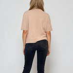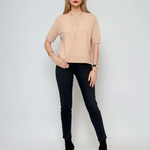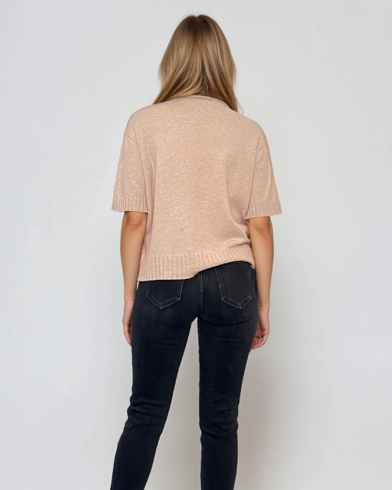 Pulover cu mânecă scurtă și bordură stil pliseu beige este o piesă versatilă, cu un aer rafinat. Tonul cald, neutru, este pus în valoare de bordura delicată stil pliseu, care oferă un plus de textură și interes vizual.