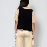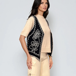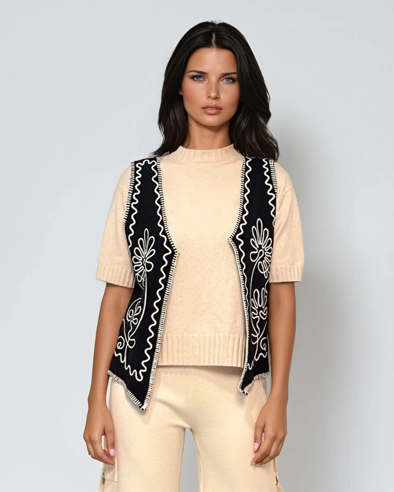 Vestă cu flori brodate neagră este o piesă chic și elegantă, perfectă pentru a adăuga profunzime și contrast oricărei ținute. Broderia florală se remarcă subtil pe fundalul închis, oferind un efect vizual deosebit și o notă artistică.