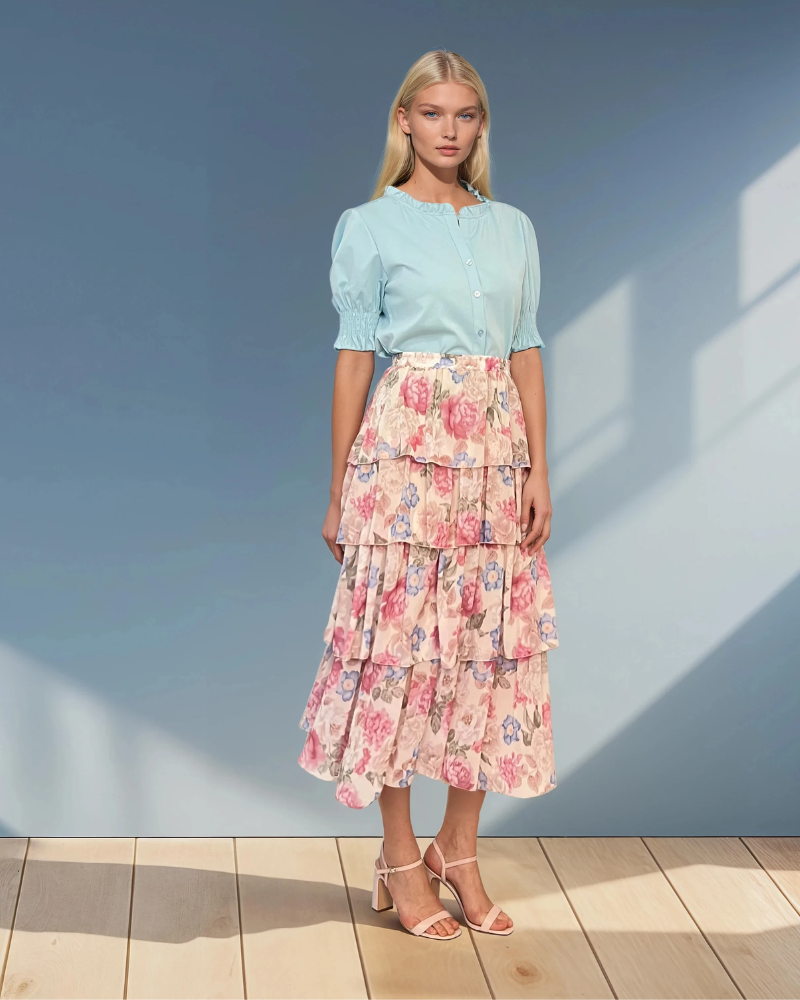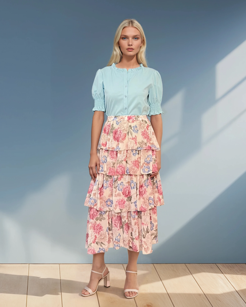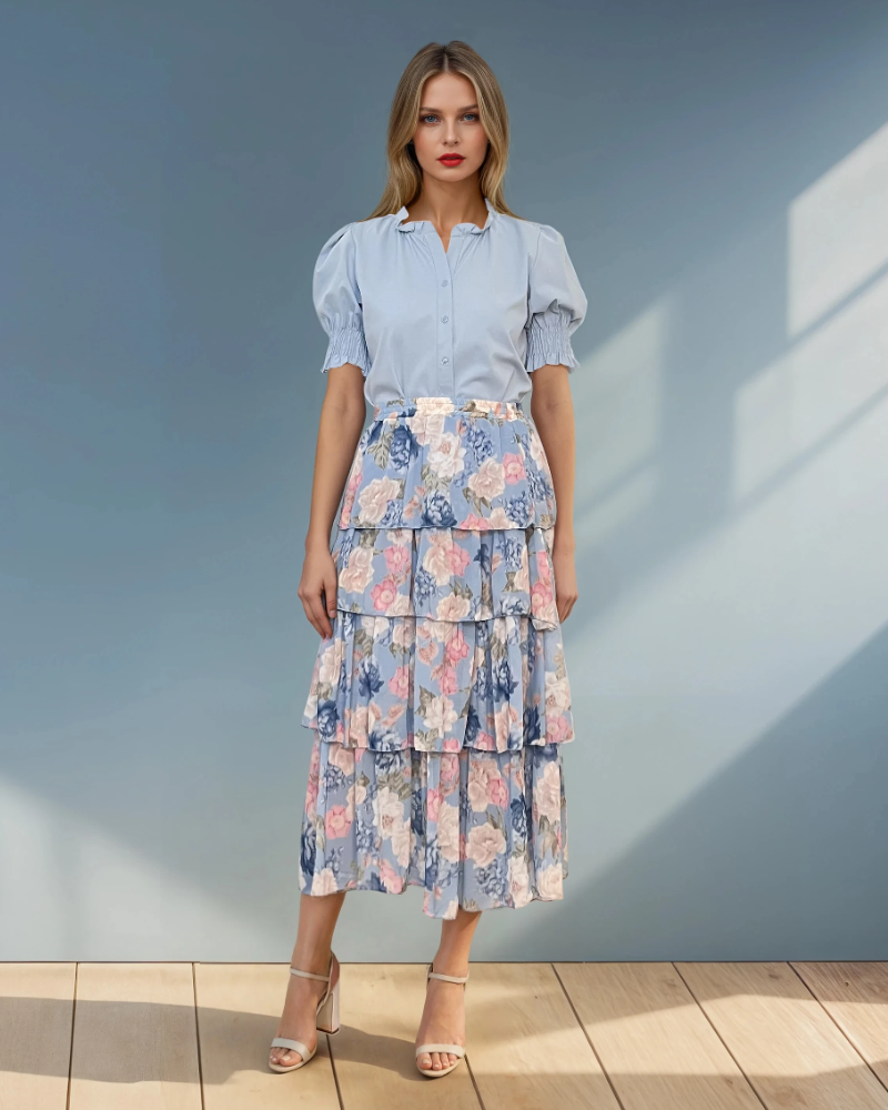 Fustă lungă cu volane și print floral bleu
